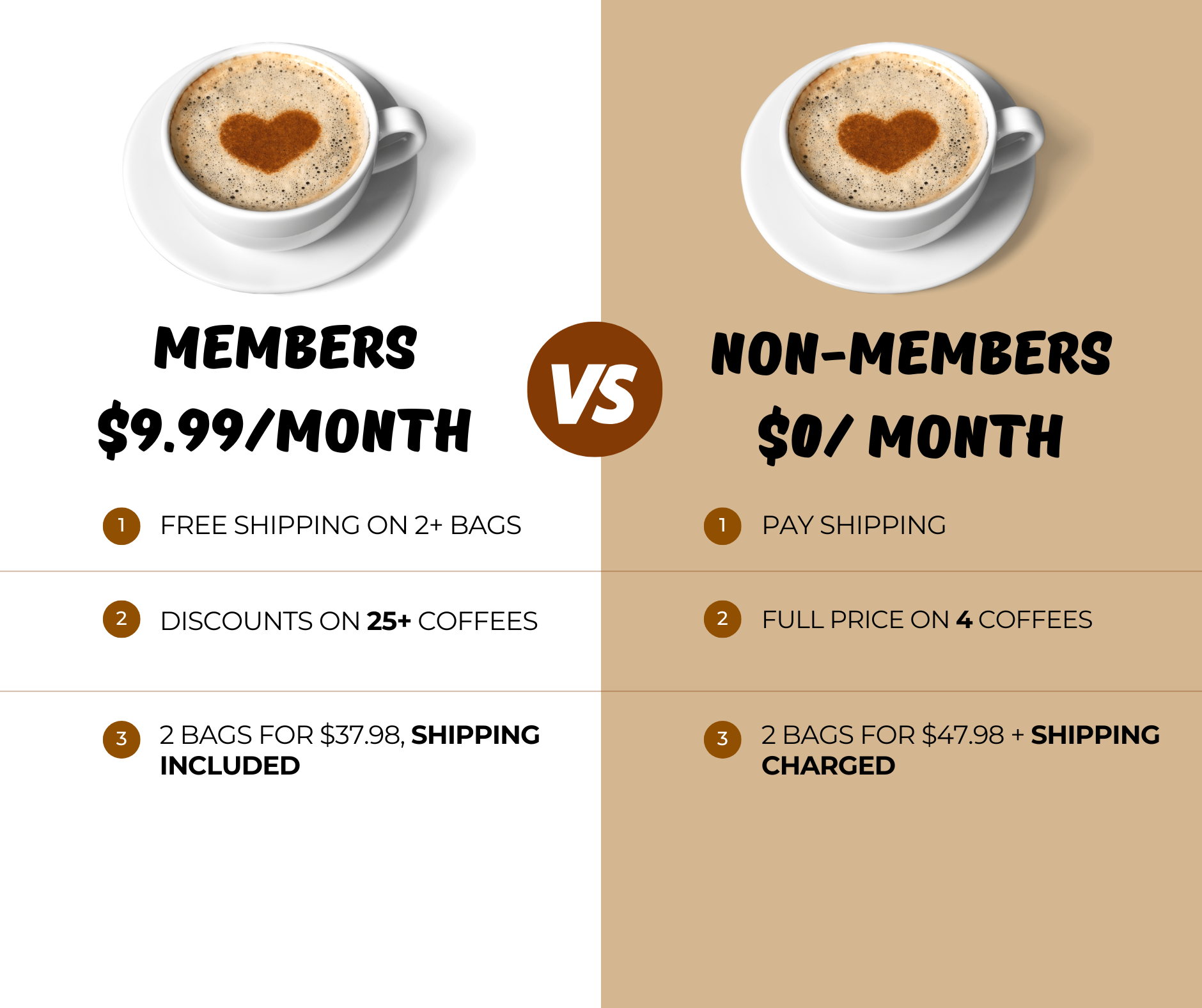 For the price of one coffee at a coffee shop you can cover your membership for the month. Coffee Club Membership is $9.99 per month. Member pricing on most coffees is $15.99/bag when ordering 2 or more.